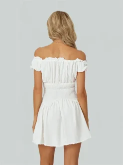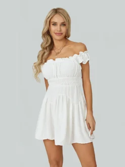 Women Summer Short Dress, Solid Color Ruched Bust Boat Neck Off Shoulder Puff Sleeve A-Line for Ladies