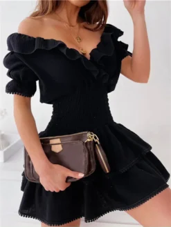 Women Summer White Dress Puff Short Sleeve Off Shoulder Ruffle Layered Dress Bohemian Y2K Aesthetic Dresses Female
